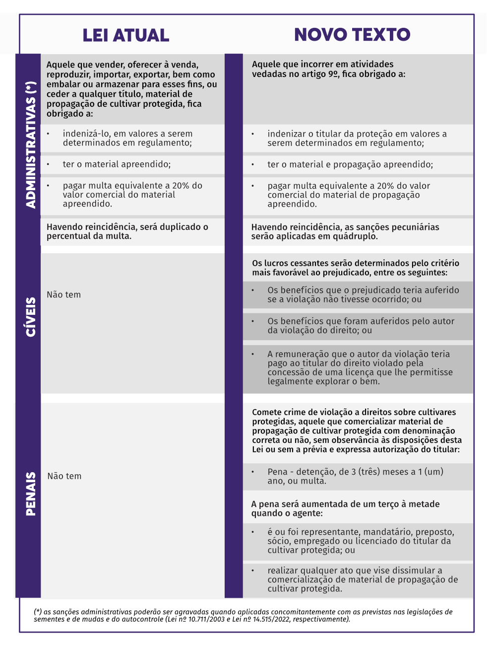 Ao lado das sanções administrativas vigentes, o PL prevê sanções cíveis e penais a quem incorrer em atividade vedada na lei. Esse é um passo importantíssimo no sentido de dotar de instrumentos legais consistentes as ações de combate à pirataria de sementes e de mudas de cultivares protegidas (ver tabela no texto).