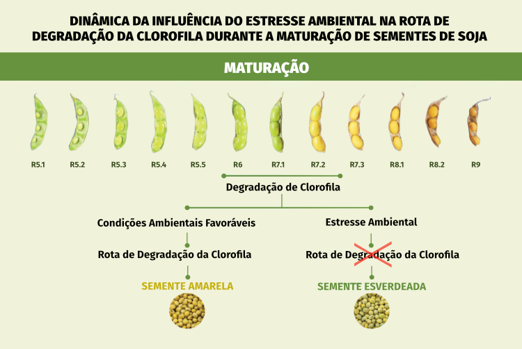 Neste caso, o gatilho inicial é a combinação entre estresse abiótico em momento crítico de desenvolvimento e a suscetibilidade genética do material. Os estresses mais frequentes são temperaturas elevadas e deficiência hídrica, muitas vezes atuando em conjunto, com intensidade e duração capazes de interromper a rota de degradação da clorofila na cultura da soja. Quando o estresse ocorre tardiamente, a partir do estádio R6, durante a fase de desidratação e aquisição da quiescência, o risco de retenção de clorofila aumenta. Nessa etapa final de maturação, a redução do teor de água e as alterações hormonais devem coordenar tanto a desestruturação dos cloroplastos quanto a degradação da clorofila. Se a perda de água ocorre sob condições adversas, essa degradação pode ser suprimida, enquanto os níveis de ácido abscísico se elevam, alterando a regulação da transcrição de genes da rota (Figura no texto).