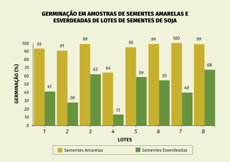 Os resultados de germinação e vigor em amostras de sementes amarelas e amostras de sementes esverdeadas evidenciaram o impacto da retenção de clorofila sobre a qualidade inicial das sementes. Nos oito lotes avaliados na segunda etapa do estudo, sementes amarelas mantiveram germinação elevada, em geral entre 90 e 100%, enquanto as sementes esverdeadas apresentaram valores inferiores e mais variáveis, de 13 a 68%.