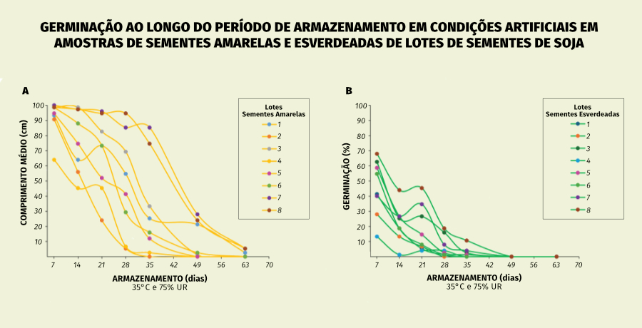 Os resultados na comparação entre as amostras de sementes amarelas e amostras de sementes esverdeadas submetidas ao armazenamento em condições artificiais, com alta temperatura e alta umidade relativa do ar (35 ºC e 75% UR), condições que favorecem a aceleração da taxa de envelhecimento, indicam um comportamento distinto em relação à capacidade de manutenção da germinação ao longo do tempo. As amostras de sementes amarelas iniciaram o armazenamento com germinações elevadas, próximas a 100%, apresentaram declínio gradual ao longo dos dias, demonstrando maior resistência à deterioração. Por outro lado, as sementes esverdeadas apresentaram desempenho nitidamente inferior. No início do armazenamento, os valores de germinação já eram mais baixos e declinaram muito mais rapidamente nas primeiras semanas. Em menos de 21 dias de armazenamento, houve a redução em todos os lotes avaliados.