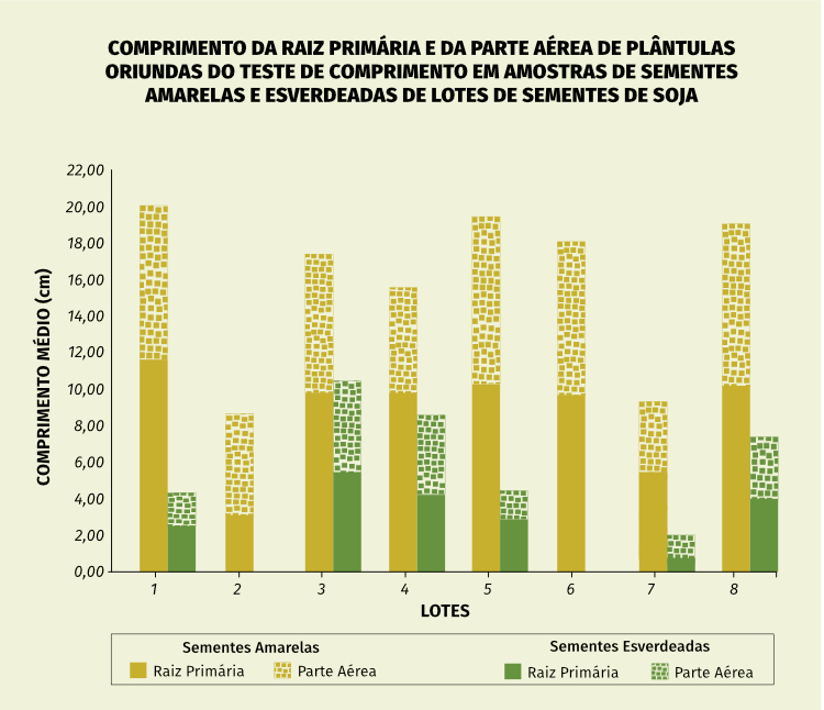 O teste de comprimento de plântulas confirmou o padrão, com reduções mais acentuadas no comprimento da raiz primária e da parte aérea, resultando em plântulas menores e menos uniformes. Em síntese, as amostras com presença de clorofila apresentaram menor germinação e vigor, com comprometimento no desenvolvimento das plântulas. Verifica-se de forma clara grande variação na qualidade fisiológica inicial entre as amostras que se diferenciam quanto à presença de clorofila nas sementes, independentemente da cultivar.