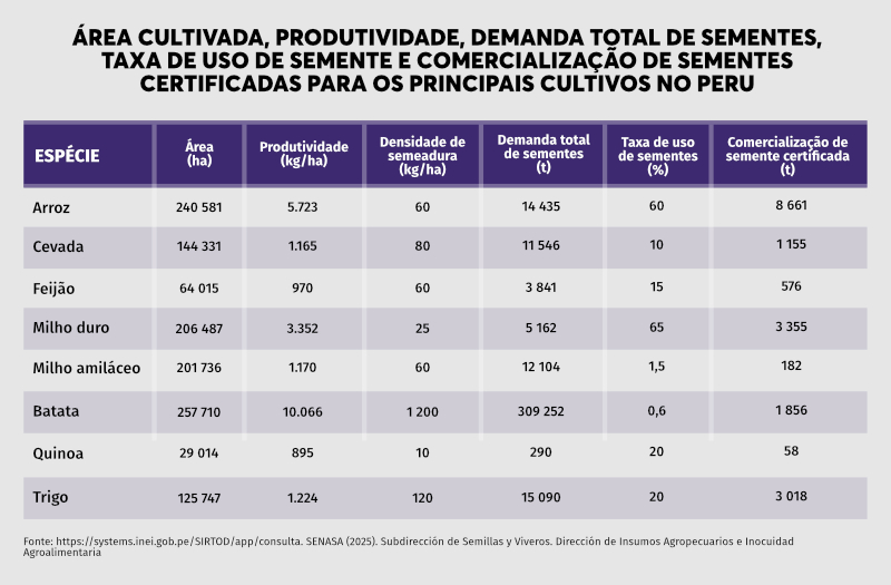O SENASA é a autoridade nacional de sementes, sendo responsável pela certificação, enquanto o INIA, universidades e empresas privadas realizam a pesquisa e a produção de sementes. Atualmente, o país possui mais de 400 variedades registradas e 350 produtores de sementes credenciados, dos quais aproximadamente 70% são micro e pequenos produtores associados a projetos de desenvolvimento regional.
