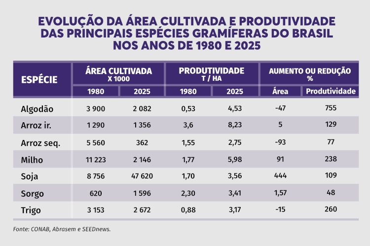 Por outro lado, no ano de 2024, o país cultivou mais de 70 milhões de hectares com as principais culturas graníferas, destacando-se a soja com mais de 47 milhões de hectares, cultivada praticamente em todo o país, destacando-se as regiões tropicais e subtropicais, com mais de 60% da área, assim como do milho. Nesse sentido, salienta-se que o cultivo do algodão atualmente é no Centro-Oeste, conduzido em larga escala por agricultores com uso de alta tecnologia, enquanto em 1980 era principalmente no Nordeste por pequenos agricultores utilizando baixa tecnologia (inclusive utilizando sementes com línter).
