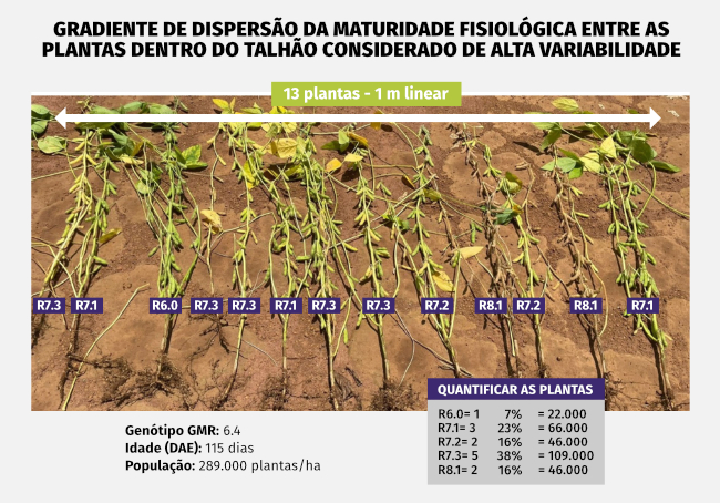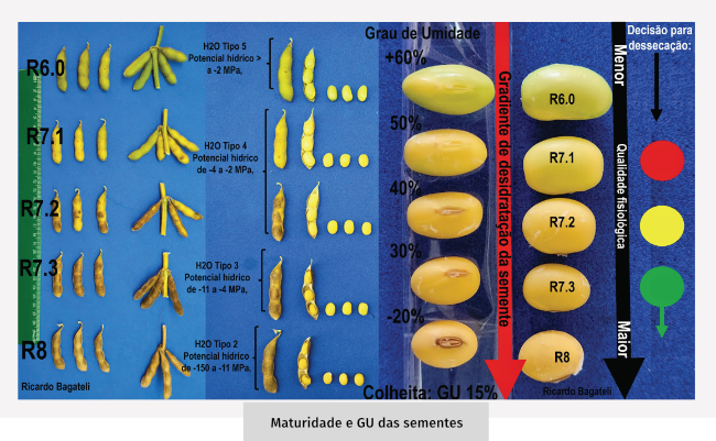 O ponto ideal é o estádio que coincide com a maturidade fisiológica, pois as sementes já atingiram o máximo acúmulo de matéria seca e o "cordão umbilical" (funículo) que as liga à planta se desconecta, coincidindo com máxima qualidade fisiológica das sementes. Identificar corretamente o estágio adequado requer muita experiência, pois as escalas fenológicas levam em conta um cadenciamento do processo de maturação que não acontece mais nas cultivares modernas.