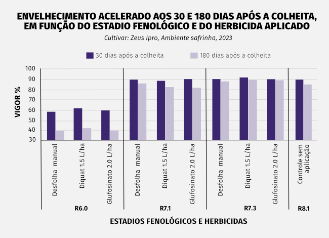 Apesar dos benefícios comprovados da dessecação, lacunas significativas na pesquisa permanecem. A resposta de genótipos modernos de soja com características de maturação contrastantes a esses diferentes mecanismos de herbicidas precisa ser levada em conta. Além disso, a maioria dos estudos se concentra na qualidade imediata das sementes após a colheita, com pouca ênfase na longevidade, um parâmetro crítico para a indústria de sementes. Mais importante ainda, a complexa interação genótipo × ambiente × herbicida raramente é analisada em nível de campo usando ferramentas estatísticas avançadas, capazes de quantificar a contribuição relativa de cada fator. A figura no texto demonstra efeitos no desempenho de plântulas transcorridos 180 dias após a colheita.