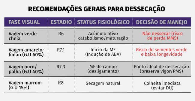 Como todos sabem, a dessecação viabiliza a antecipação da retirada das sementes de um ambiente hostil. Além de reduzir a exposição aos fungos de final de ciclo, previne o dano mecânico, pois a colheita pode ser feita com umidade mais uniforme (entre 13% e 15%), evitando o "esmagamento" de grãos muito úmidos ou a "quebra/trincamento" de grãos excessivamente secos (abaixo de 12%).