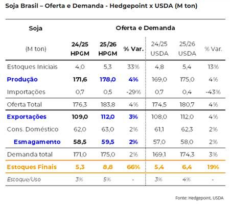 A primeira estimativa da Hedgepoint para nova safra brasileira de soja, temporada 2025/26, aponta para um potencial produtivo de 178 milhões de toneladas, o que, se confirmado, resultará em mais uma produção recorde do maior país produtor de soja do mundo.