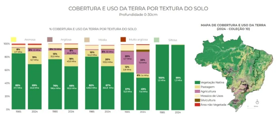 Historicamente solos muito argilosos são os mais utilizados para a agricultura e ocuparam 33% dessa textura em 2024. É a única classe textural de solo onde a agricultura supera a pastagem. Isso é reflexo das condições físicas favoráveis do solo argiloso para o desenvolvimento de raízes, maior capacidade de armazenamento de nutrientes e maior estabilidade estrutural, reduzindo a erosão e favorecendo o manejo.