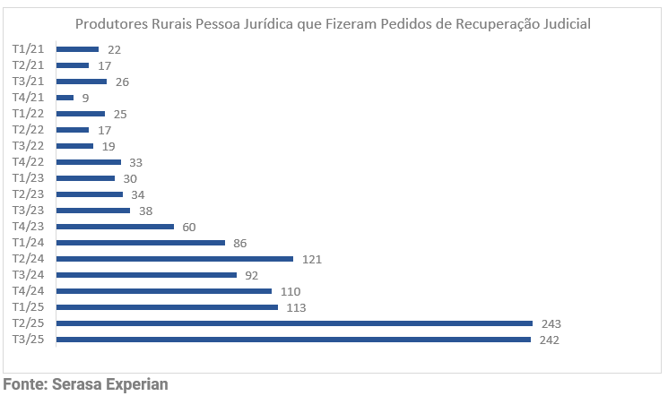 O índice mostra que os produtores rurais com perfil de Pessoa Jurídica acumularam 242 pedidos de recuperação judicial no terceiro trimestre de 2025. Em comparação ao mesmo período do ano anterior é possível identificar uma expansão.