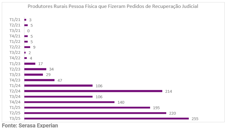 Os produtores rurais brasileiros que atuam como Pessoa Física registraram 255 solicitações de recuperação judicial no terceiro trimestre de 2025. Frente ao mesmo período de 2024 houve aumento, pois o trimestre tinha acumulado 106 pedidos.