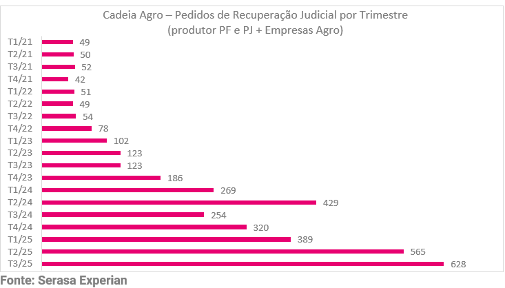 Novos dados da Serasa Experian, primeira e maior datatech do Brasil, revelam que o terceiro trimestre deste ano registrou a maior quantidade de pedidos de recuperação judicial desde 2021. Foram 628 requisições, frente às 254 registradas no mesmo período de 2024. Esse cenário reflete a piora no ambiente de crédito do setor – representando produtores rurais como pessoa física e jurídica, além de empresas relacionadas ao agronegócio. Confira no gráfico a seguir as informações de cada trimestre em toda a série histórica do índice.