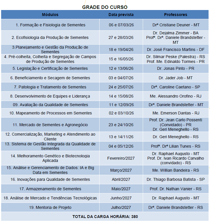 O setor de sementes é a base da produtividade agrícola além de muito pujante nesta região do Brasil e da competitividade do agronegócio nacional e internacional. As rápidas transformações tecnológicas, as exigências regulatórias e a busca por eficiência e sustentabilidade demandam profissionais com formação multidisciplinar, capazes de aliar ciência, gestão e inovação.