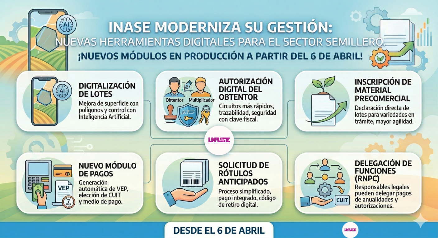 O Instituto Nacional de Sementes (INASE) continua avançando na atualização e adaptação de seus processos administrativos. A partir de 6 de abril, novos módulos serão implementados no Sistema de Gestão e no Portal de Serviços, projetados para promover a autogestão, simplificar os procedimentos e garantir transparência e rastreabilidade em toda a cadeia de suprimentos na Argentina.
