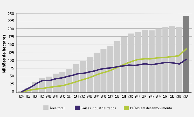 De acordo com o relatório da ISAAA, "Situação Global das Culturas GM/Biotecnológicas Comercializadas: 2024", a adoção de culturas biotecnológicas passou por uma mudança significativa nas últimas décadas. Desde 2012, os países em desenvolvimento assumiram a liderança em área plantada, consolidando sua dominância.