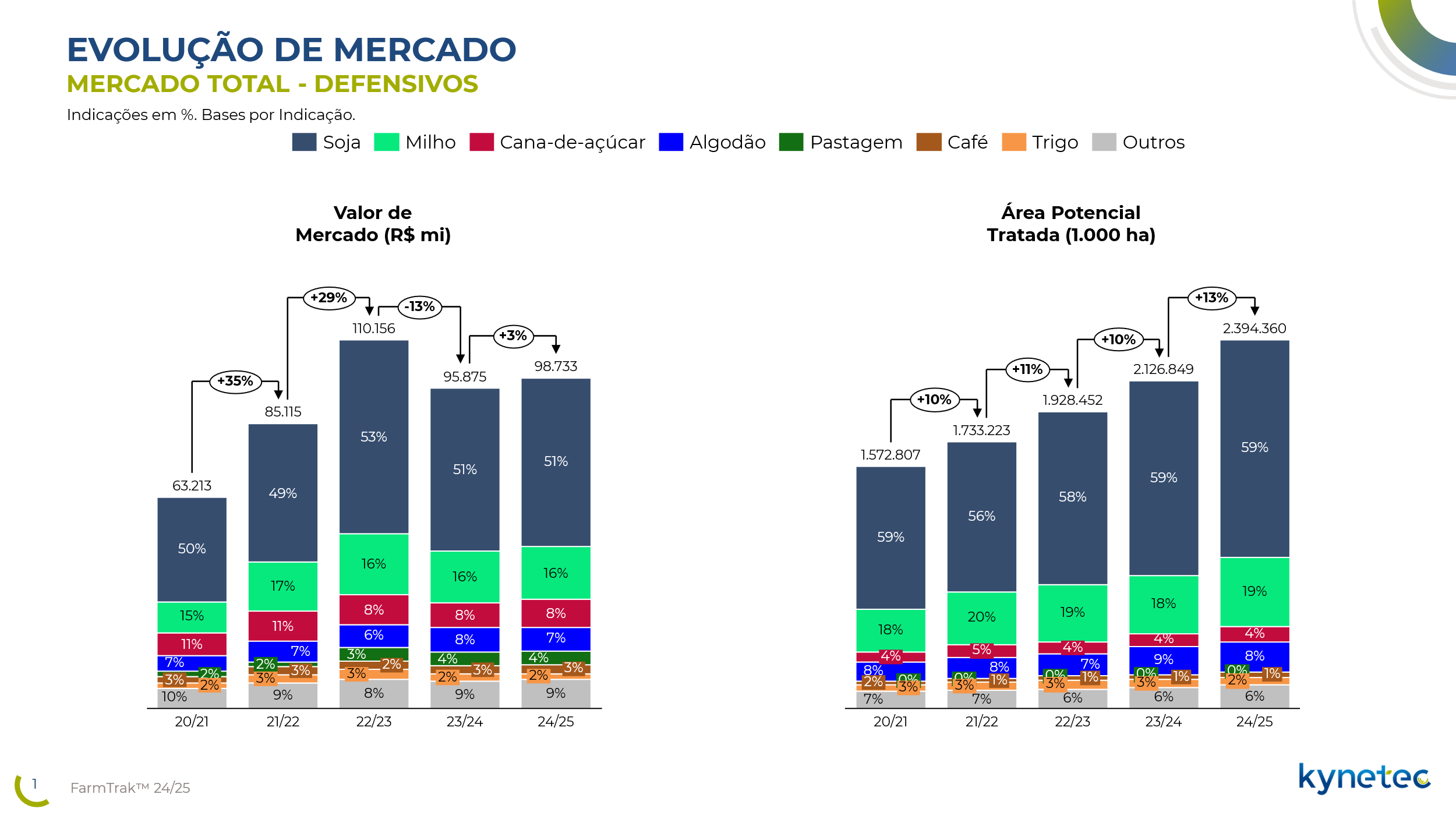 A expectativa da consultoria é a de que o mercado volte a apresentar crescimento, em reais, na safra 2025-26, na faixa de 8%. “Esse crescimento potencial deve ser puxado pelas culturas de soja e milho e relacionado a aumento de área plantada e à intensidade dos tratamentos adotados.”